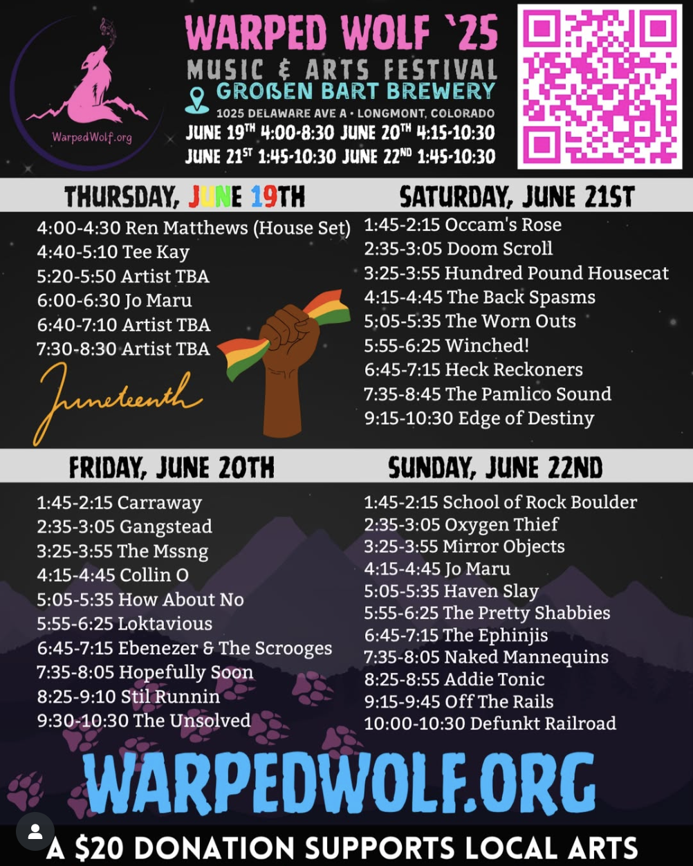 Warped Wolf Music and Art Festival at Grossenbart Brewery Jun 19 Warped Wolf Music and Art Festival at Grossenbart Brewery June 19, 2025 @ 8:00 am - June 22, 2025 @ 5:00 pm MDT